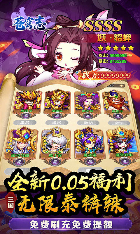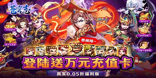 这是是一款三国卡牌类手游,福利版本充值仅需0.05折扣,天神开局送V8,VIP礼包领不停,每天登陆更有海量神将令赠送,海量神将等你来收集。万元充值等你来免费领取。赶紧带领你的无敌团队来横扫三国吧。